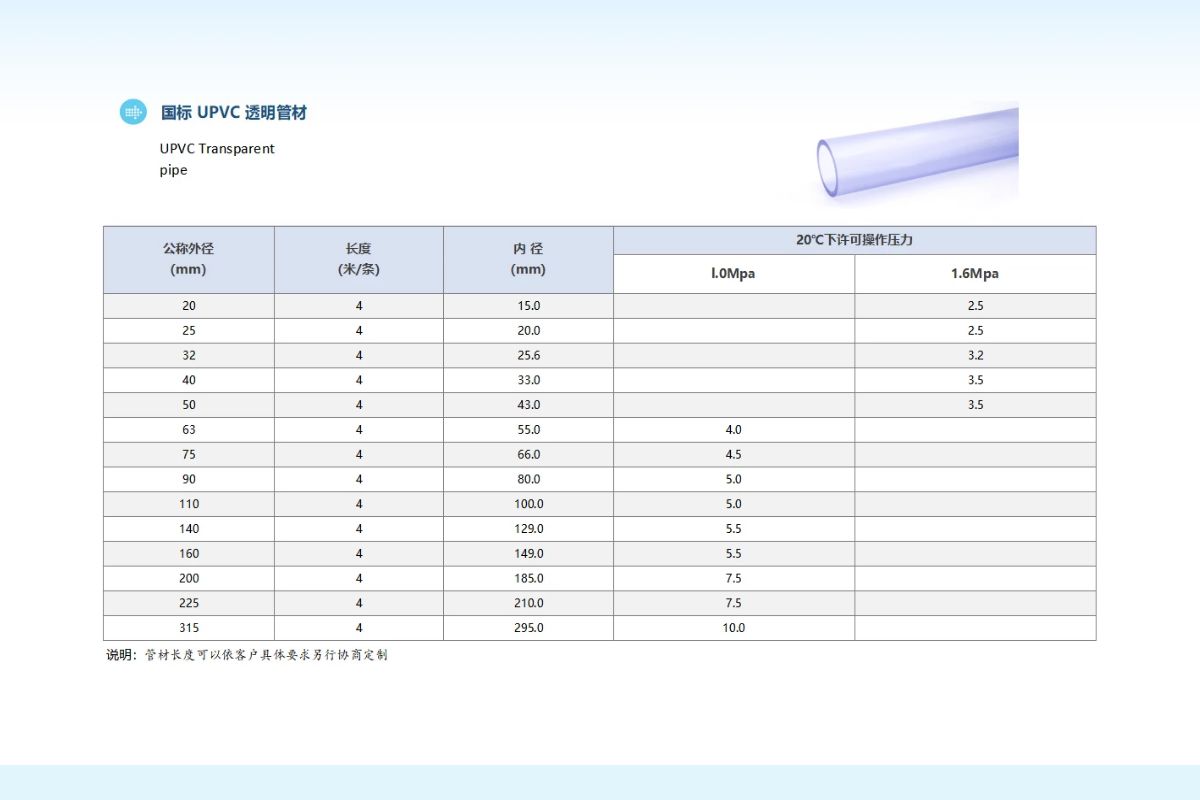 UPVC透明管用於輸送(sòng)危險化學品(pǐn)管路保護套管,便於監視觀察和(hé)保(bǎo)護作用,耐(nài)酸堿,防紫外線防腐無毒環保安全。