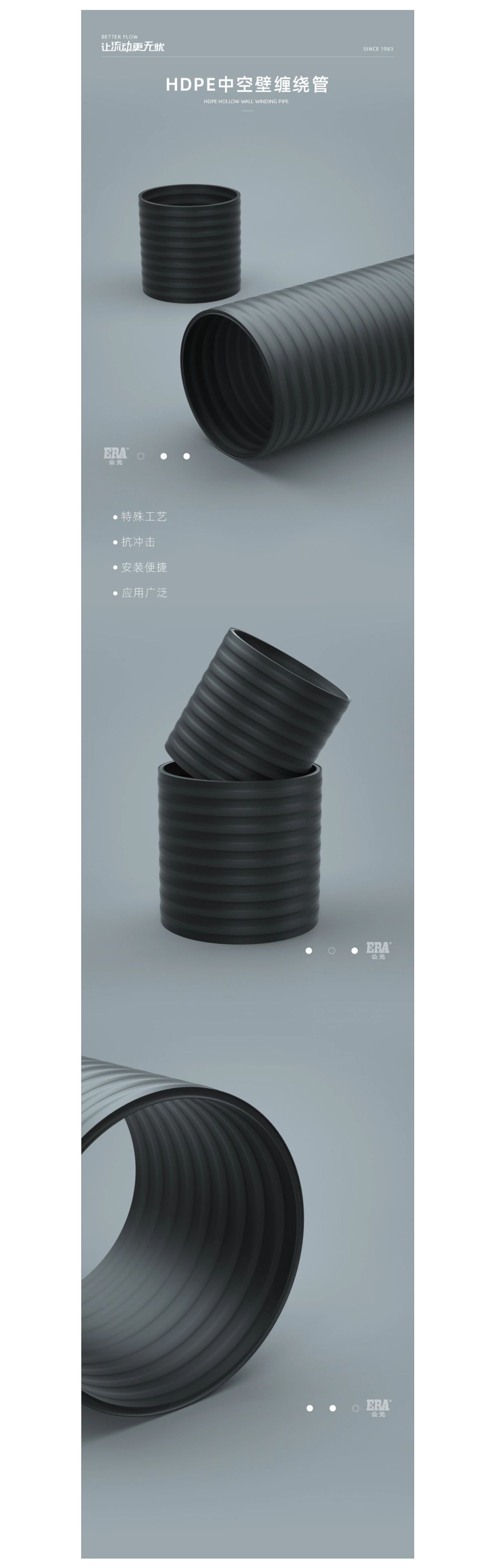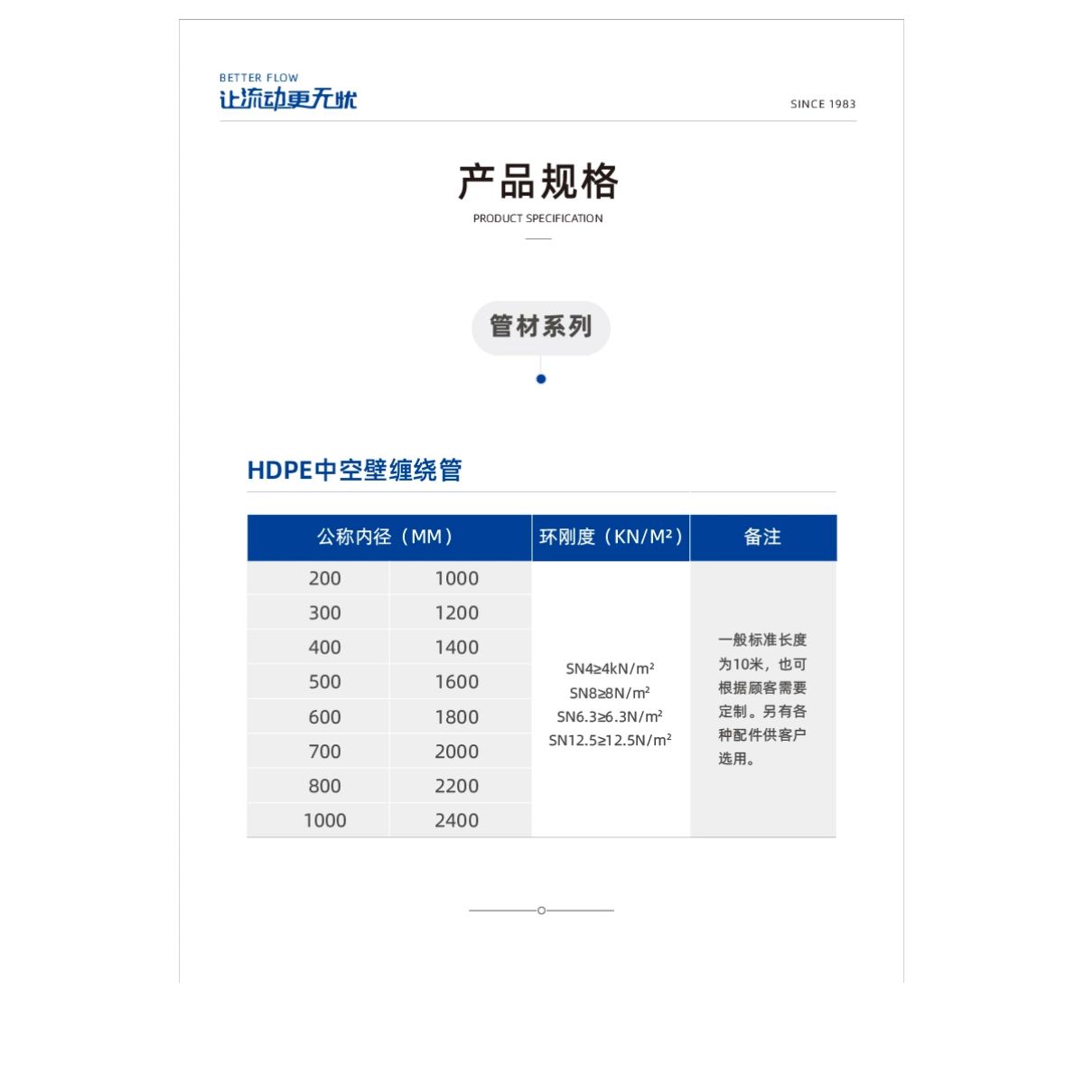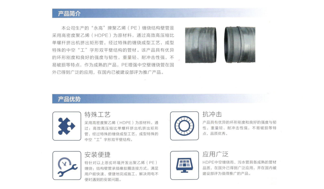 產品執行標準為GB/T 19472.2《埋地用聚乙烯(PE)結構壁管道係統 第2部分:聚乙烯(xī)纏繞結構壁管材》,具有優(yōu)異的環剛度和良好的強度與韌性,重量輕、耐衝擊性強,不易破損等特點(diǎn),產品技術成熟,在國外已得到廣泛應用(yòng),在國內已被建設部評為(wéi)推廣產品。